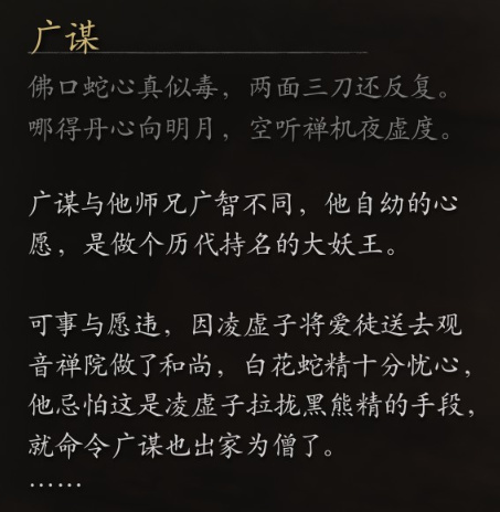 繼續前行,天命人遇到了一個蛇妖,擅長術法。他是廣智的師弟,金池的另外一位高僧。