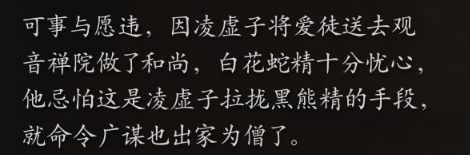 但是蛇派很忌憚狼派,黑熊精就像打破蛇派和狼派平衡的一顆石子,爲了防止黑熊精倒向狼派,蛇派也向黑熊精釋放了足夠多的善意,把蛇派的廣謀也送往黑風山,成爲了黑熊精的手下。