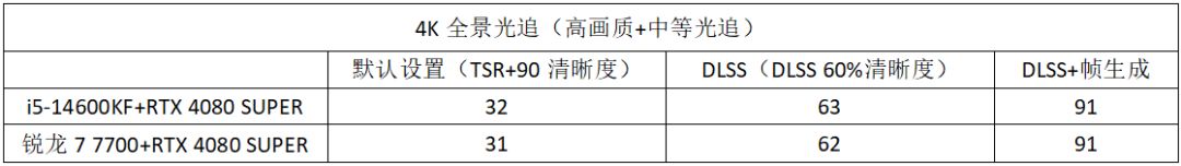從測試結果可以看到,在4K全景光追(高畫質+中等光追)的設置下,《黑神話:悟空》對顯卡性能的要求可不低。在默認設置下,i5-14600KF/銳龍7 7700+RTX 4080 Super的兩套配置只能獲得32fps和31fps的畫面平均幀率,只能說堪堪達到了勉強可以玩的水平。好在只要開啓DLSS 3,畫面平均幀率立馬提升到了60fps以上,輕鬆實現流暢畫面。當然再打開幀生成之後,兩套配置均獲得了91fps的平均幀率。