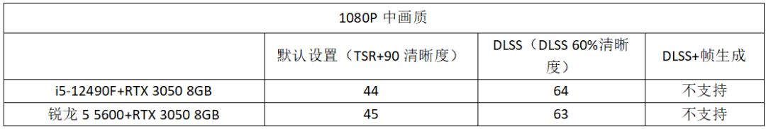 從實際遊戲表現可以看到,使用i5-12490F/銳龍5 5600+RTX 3050 8GB的配置,在1080P中畫質下,可以獲得平均44fps和45fps的畫面幀率,算是達到了流暢的門檻。如果開啓DLSS的話,兩套配置的遊戲畫面幀率都能突破60fps,達到64fps和63fps,算是相當流暢了。
