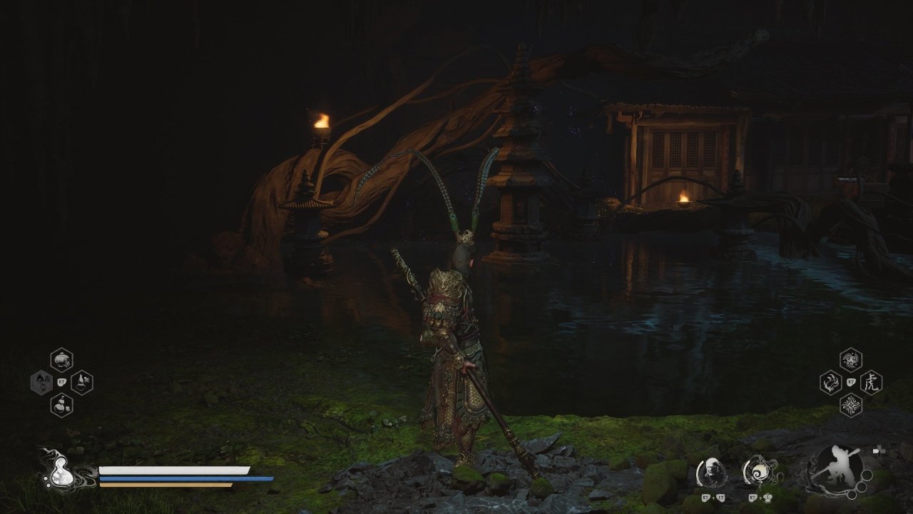 水中的小塔,附近有藍色光點,走過去互動