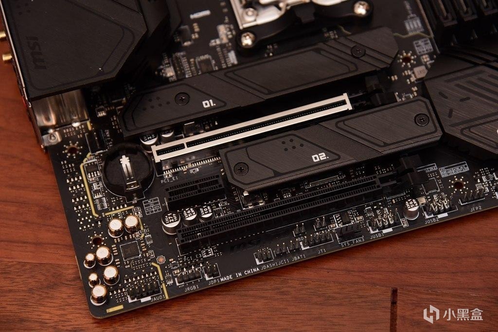 3條PCI-E插槽中,最上方1條爲PCI-E5.0x16插槽,爲加固合金插槽,最下方1條爲PCI-E4.0x16插槽,中間1條爲PCIE3.0x1插槽。