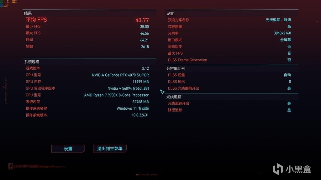 使用目前比較火熱的3A大作《賽博朋克2077》和《黑神話:悟空》,搭配RTX4070S,對比各個不同分辨率和畫質下,測試CPU性能是否能讓GPU性能完全發揮。