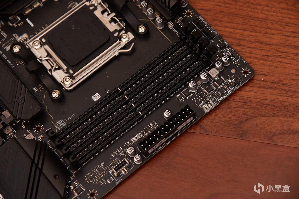 內存插槽數量爲4條,支持DDR5內存,加強了CPU和內存供電,超頻頻率最高可達6400MHz,雙通道組建位置已經標註。可惜缺少了合金裝甲的插槽保護。旁邊有USB3.2 GEN2 TYPE-C前置插槽。