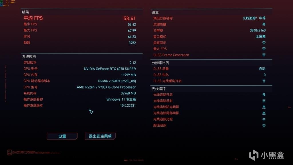 2、4K分辨率,光追中等畫質,FSR銳化自動,光線追蹤打開,平均FPS,58.41。