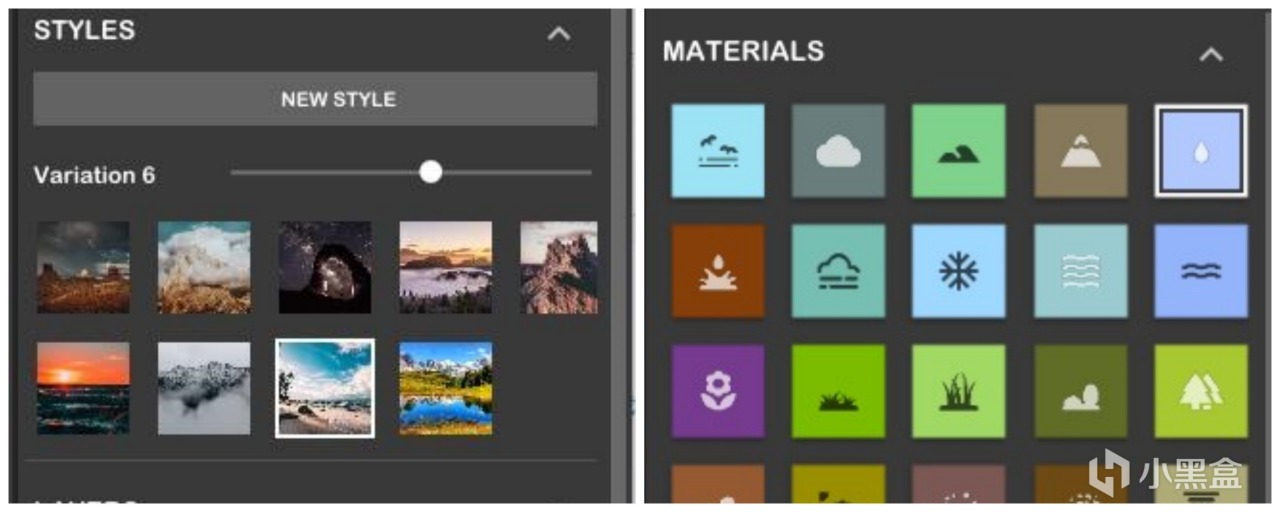 軟件的界面也很簡單,右側上面,可以畫筆選擇不同的繪畫物體類型,比如天空、水、山、沙漠等等,然後再畫布上塗抹自己想要的位置和形狀即可。同時,在下面,還可以選擇不同的場景風格,如上圖,就可以切換風景從晚霞換爲晴天。