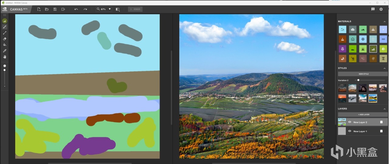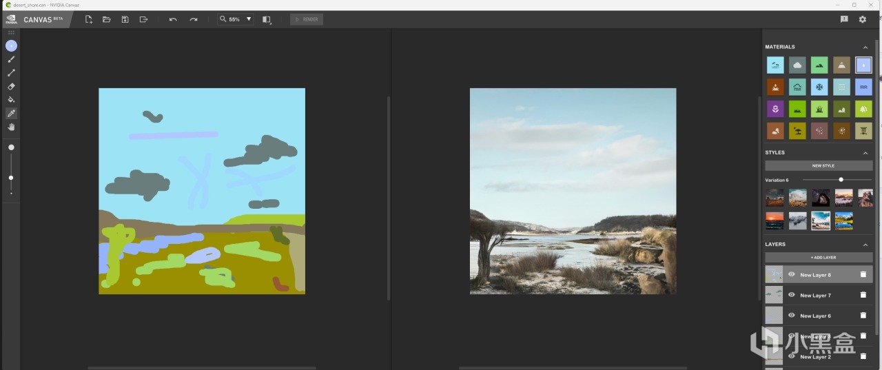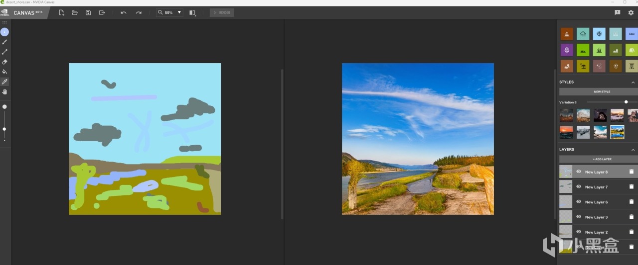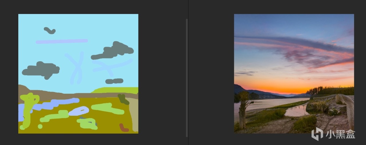不過有了AI的幫助,情況就不一樣了。使用NVIDIA Canvas,只需要會像上圖左邊那樣塗抹幾下,右側就會用AI技術,根據左側的塗抹,右側自動生成風景畫面。,是不是很神奇。