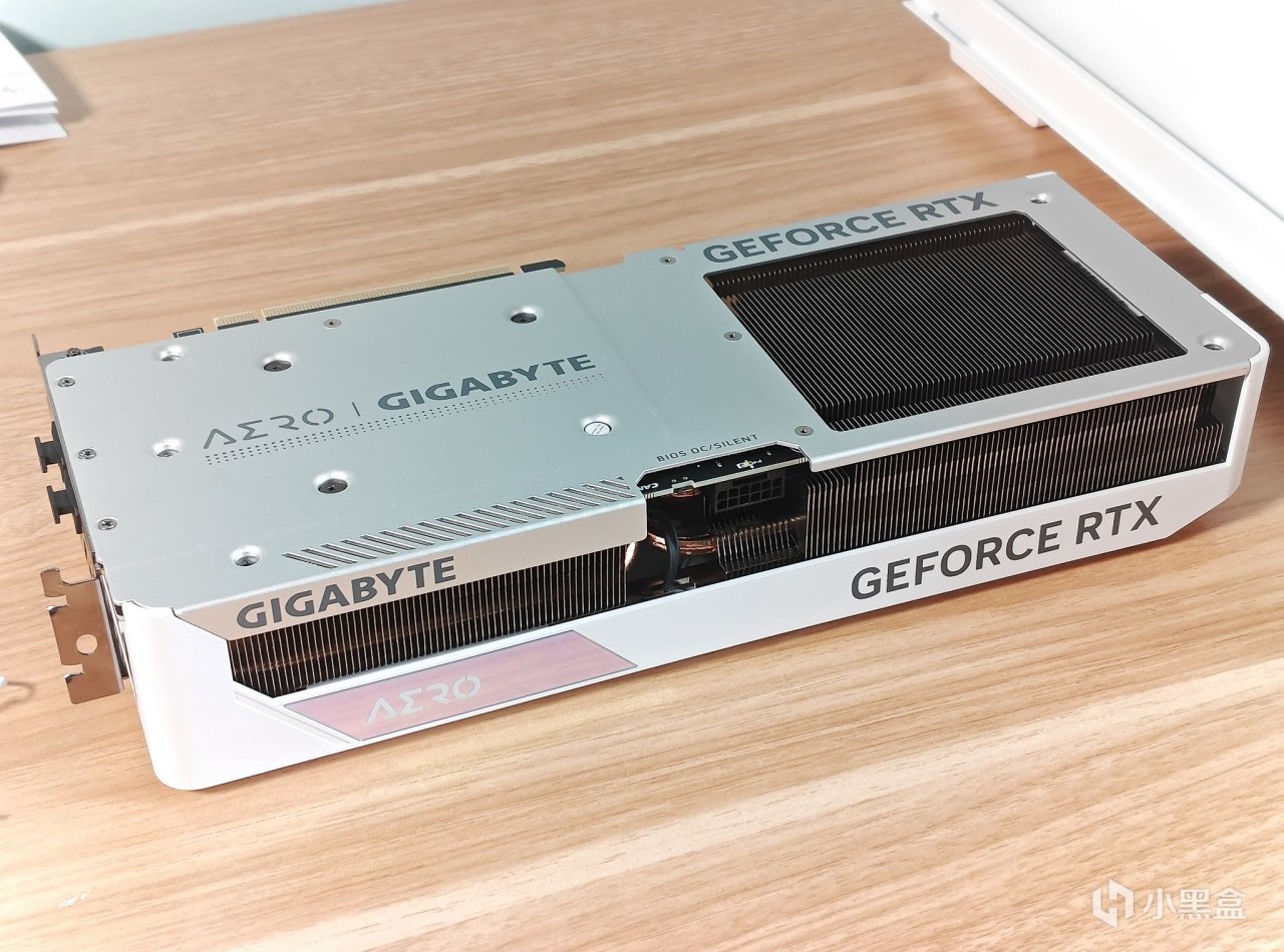 顯卡的背面採用了全金屬背板,提升顯卡堅硬度的增加散熱效果。顯卡右側有通風格柵,8根複合式熱管,可提供更好的散熱性能。供電部分是最新的16PIN 12VHPWR接口,上面還有指示燈。左側是雙BIOS切換開關,分爲超頻和靜音模式,可以自由切換。