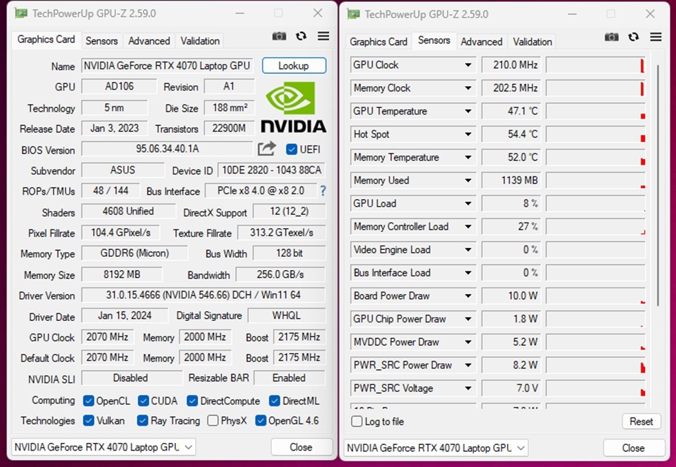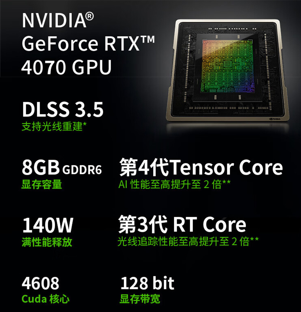 RTX 4070顯示核心,配備 AD106 GPU ,擁有 4608 個 CUDA 內核,滿血140W性能釋放。