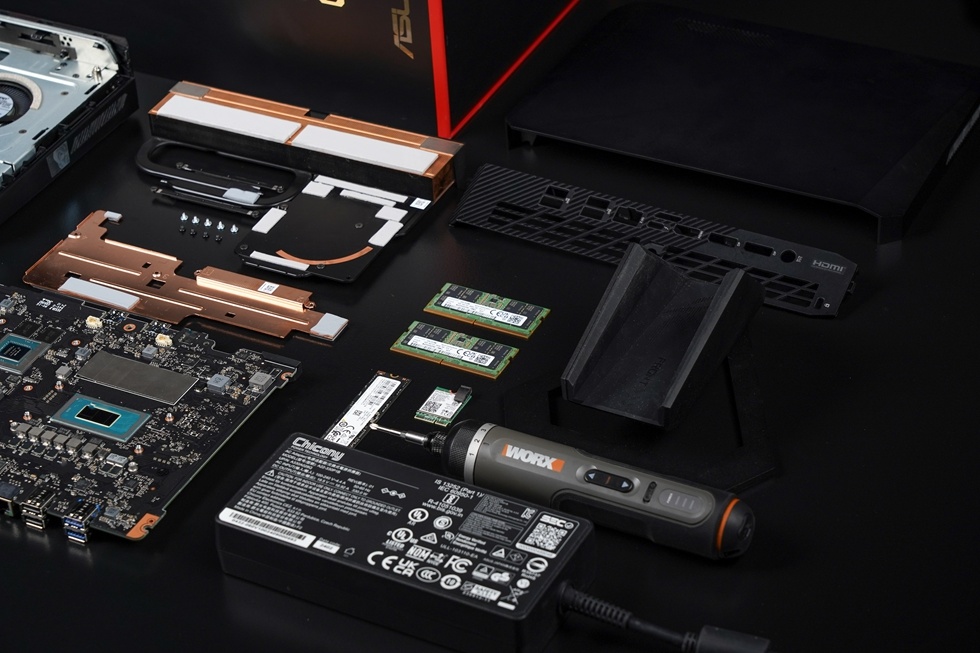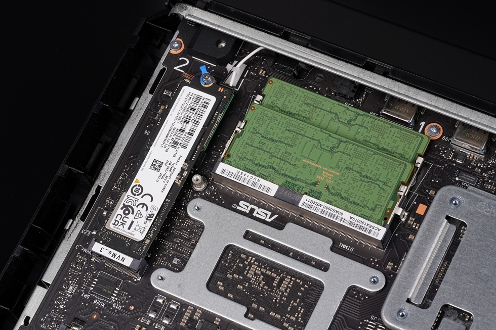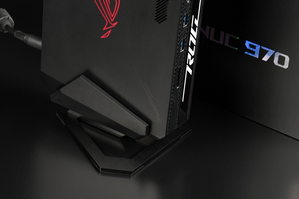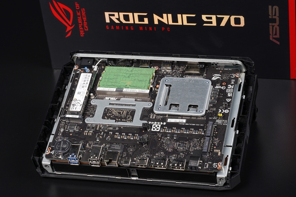 可以看到ROG NUC提供的接口非常的豐富,從左至右依次爲:2個USB3.2 Gen2,2個USB2.0,1個2.5G網口,1個雷電4接口,1個HDMI2.1,2個DP1.4a,電源接口。