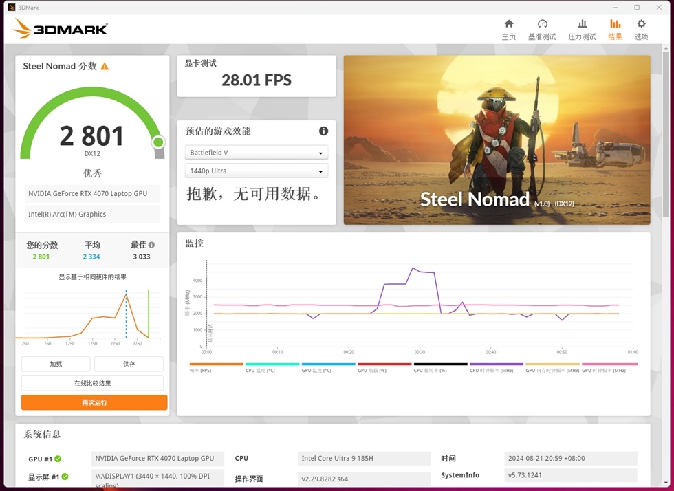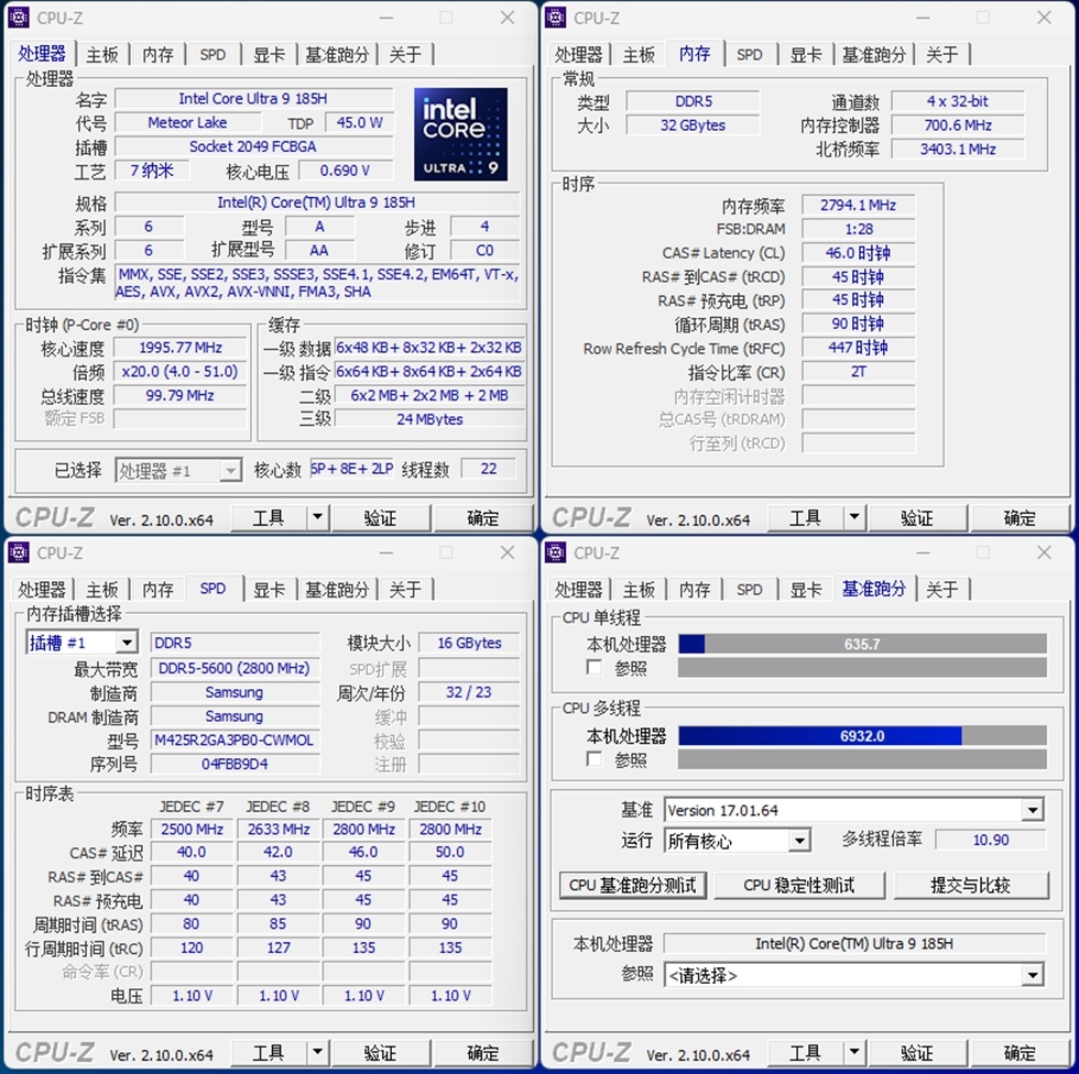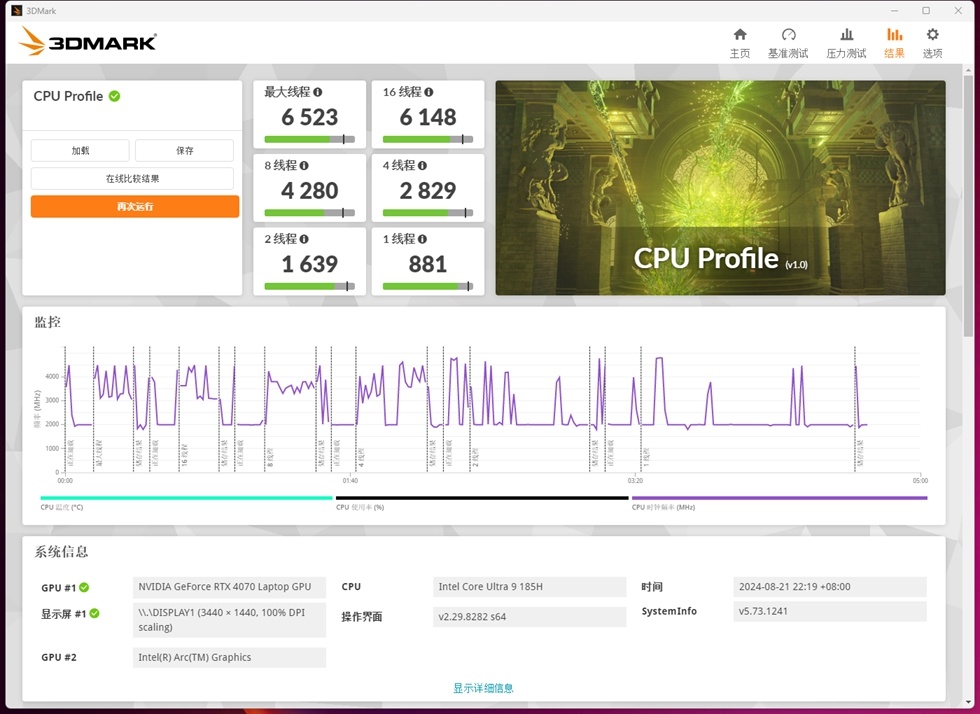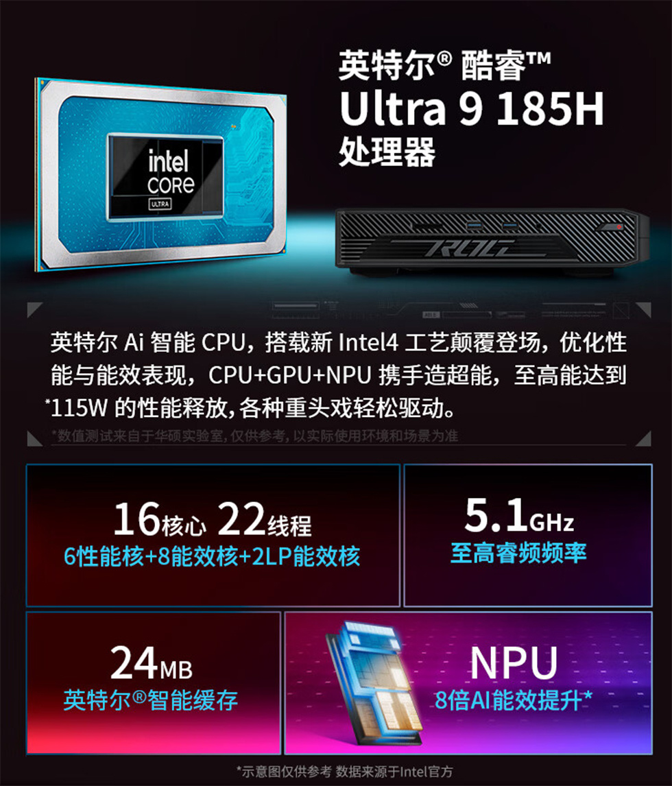 Intel 酷睿 Ultra9 185H核心,採用了6個性能核,8個能效核再加上2個超低功耗核構成,總計16核22線程。最高睿頻可以達到5.1GHz,擁有24MB三級緩存。