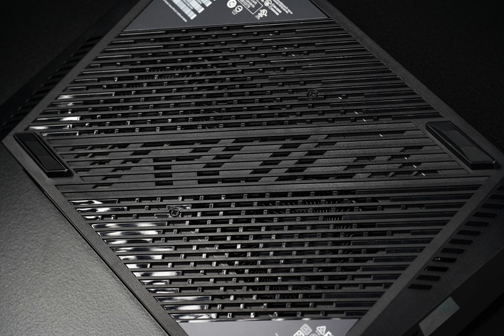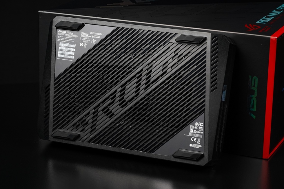 主機底部採用大面開孔作爲散熱進風,並且有ROG LOGO作爲裝飾。