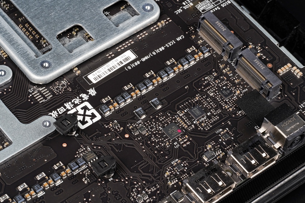 拆掉上層金屬框架後即可看到主機主板背面,可以看到所有的M.2接口以及內存插槽,非常友好的設計,方便玩家們隨時進行更換,無需繁瑣的拆裝過程。
