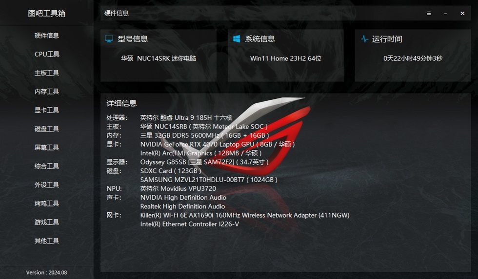 作爲RO**品線的第一臺NUC產品,憑藉小巧的體積在僅有2.5L如此緊湊的機身內塞入了非常強大的硬件配置組合,並且免工具拆解讓升級輕鬆容易,加之豐富的拓展外接功能,當之無愧的桌面Mini鋼炮,但在初代產品上也能看到一些不足之處,主要體現在其搭載的Ultra 9 185H處理器上面,可以看出在高負載環境下,其散熱能力稍顯不足,期待下一代產品可以做出改進。總的來說,經過與它朝夕相處的一週時間裏,慢慢喜歡上了這款產品,在不侵佔桌面空間的情況下,爲我提供了充足的性能釋放以及極其便利的使用環境,ROG NUC不僅僅是一臺性能優秀的遊戲主機,它也很好的勝任了各種類型的工作環境,可以是一臺HTPC,也可以是一臺辦公上網機,還可以是專業用戶手中的生產力工具,若拋開對性能和散熱的執着追求,它似乎已經慢慢融入到了我的日常工作生活之中。