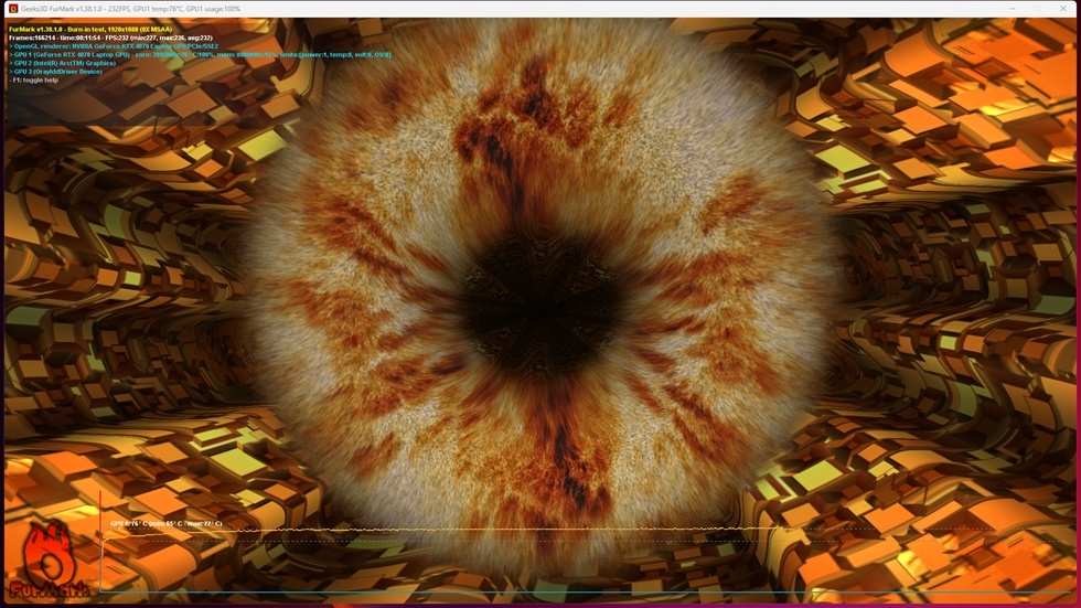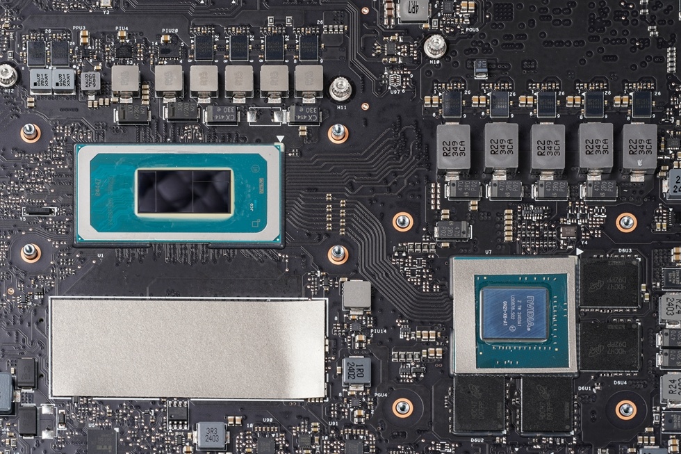 可以看到碩大的均熱板散熱模組爲顯卡提供散熱,CPU採用兩根熱管散熱,CPU散熱略顯喫力,GPU則輕鬆壓制。