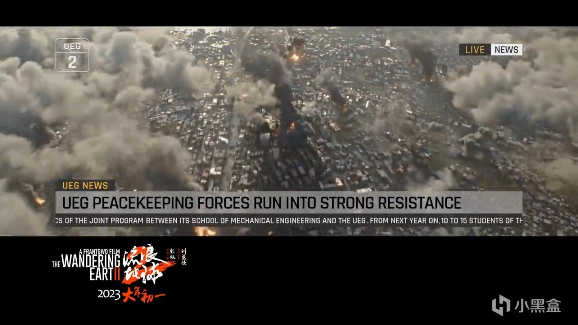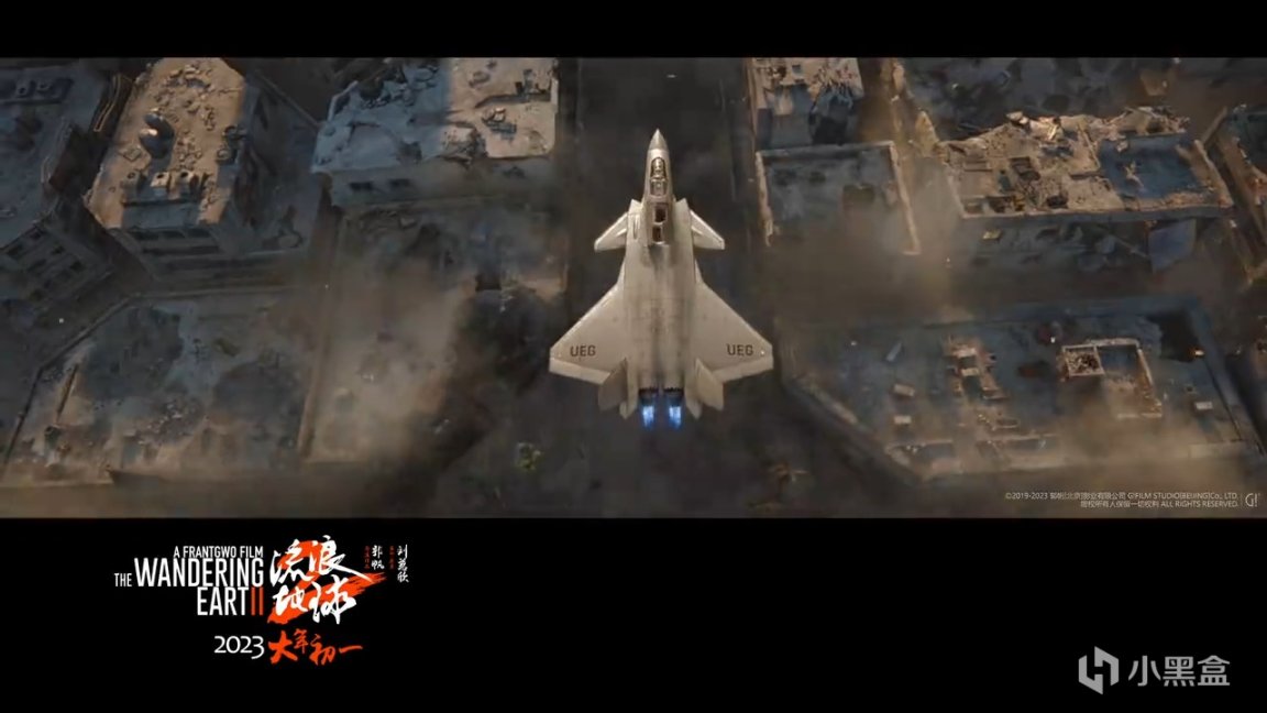 中國航天員劉培強中校,駕駛着以殲二十爲模型的五代機,執行飛行任務!而且加了兩個升力風扇,還是垂直起降,從地面可以看到人類地表的房屋已經廢棄,大家要搬入地下城備戰“逃逸時代”,這樣也呼應了第一部孩子們在地下上學的背景。機翼上縮寫UEG,即地球聯合ZF,United Earth Government。