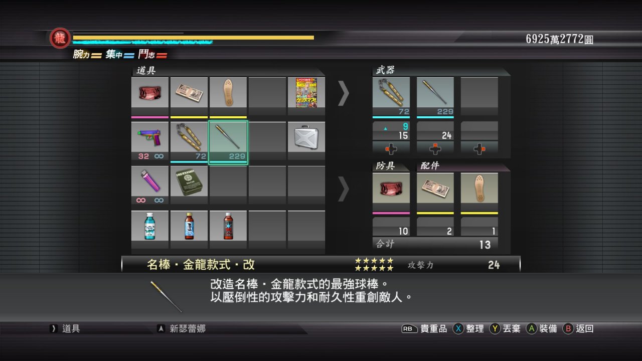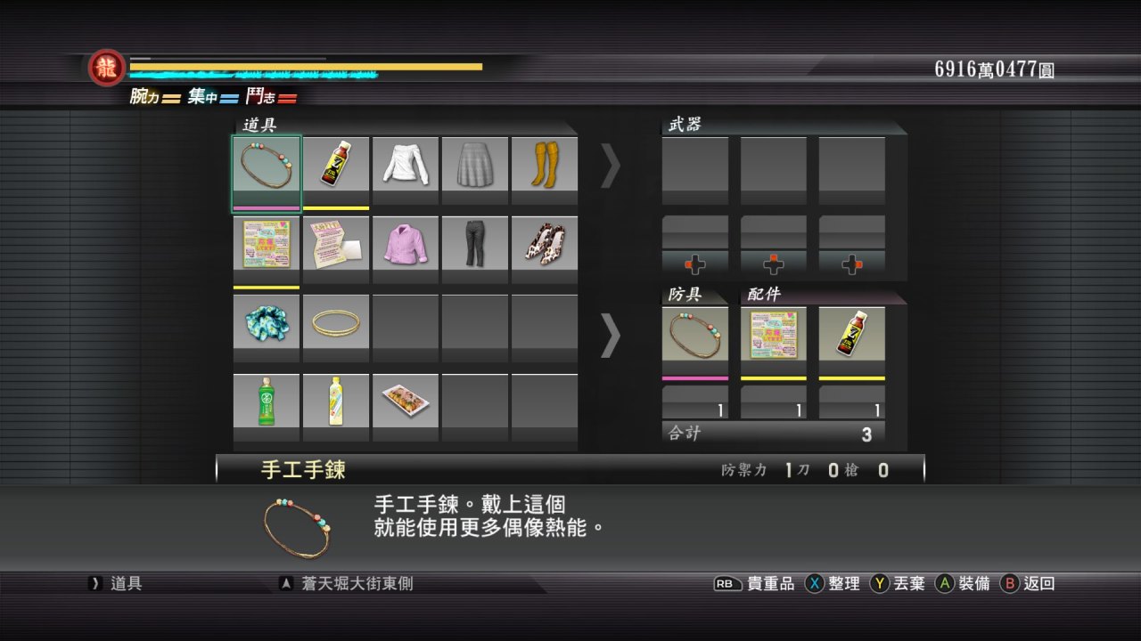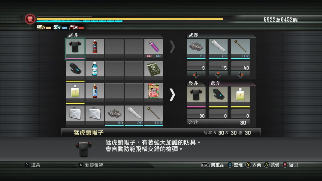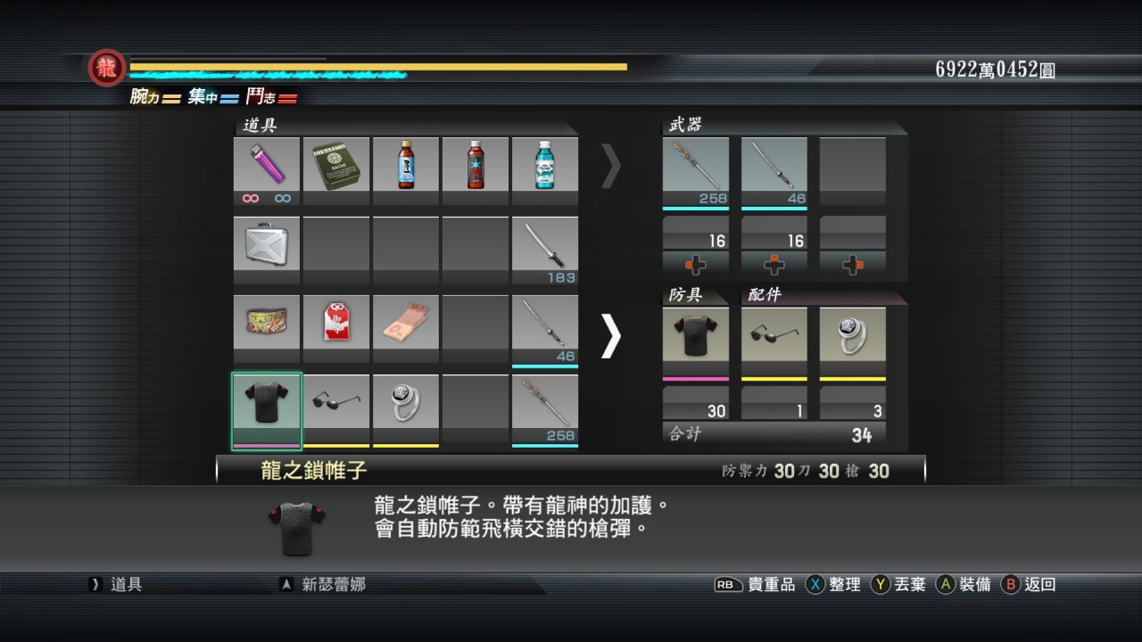 由於篇幅原因裝備部分就簡單聊一下,第一形態平和時期,初始裝備三件套,第二形態認真形態龍之鎖帷子,亞門眼鏡(會什麼帶這個眼鏡,參考如龍7桐生初登場摘墨鏡帥氣登場),還有4代就一直戴着的冠軍戒指!最後是一些精神食糧和回覆藥!