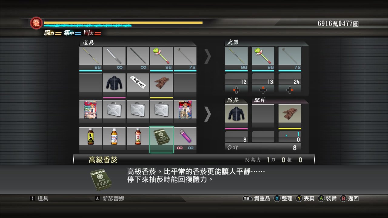 考慮到品田真的很窮,用來買裝備的錢都是其他人的(主線有說),品田的各種裝備畢竟用的不是自己的錢,品田花起來也是小心翼翼的,帶着各種優惠券,回覆藥也是買最便宜的,武器也是性價比很高低攻擊但無限耐久的,裝備是方便運動的夾克,和一顆平常心的手帕(這個我認爲特別符合品田的氣質,一直都特別謙遜!),還有個破爛圍巾(這個純整活嘿嘿)!