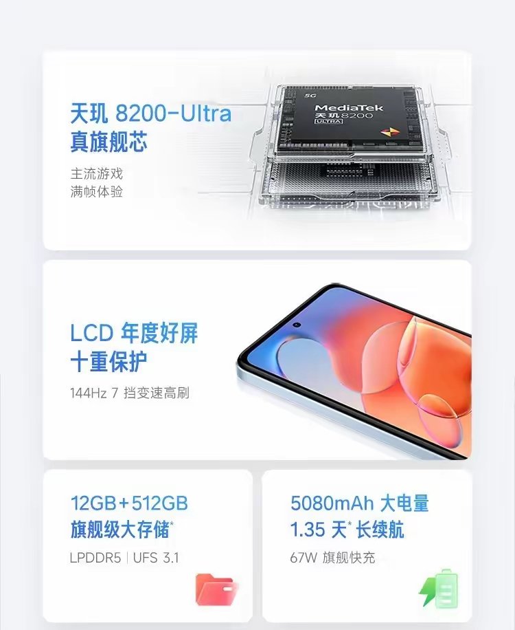 優點:這款手機匯聚了頂尖的處理技術與護眼顯示科技,搭載天璣8200-Ultra處理器,以其卓越的性能和流暢的操作體驗,爲您的工作與娛樂帶來前所未有的高效與便捷。旗艦級的LCD護眼屏,不僅畫質清晰,更有效減少藍光傷害,呵護您的雙眼,即使在長時間使用下也能保持舒適。X軸線性馬達的加入,提供了精準的觸覺反饋,無論是遊戲操作還是日常打字,都能感受到細膩而有力的震動體驗。這款手機,以強悍的性能和人性化的設計,爲您的生活注入新的活力。