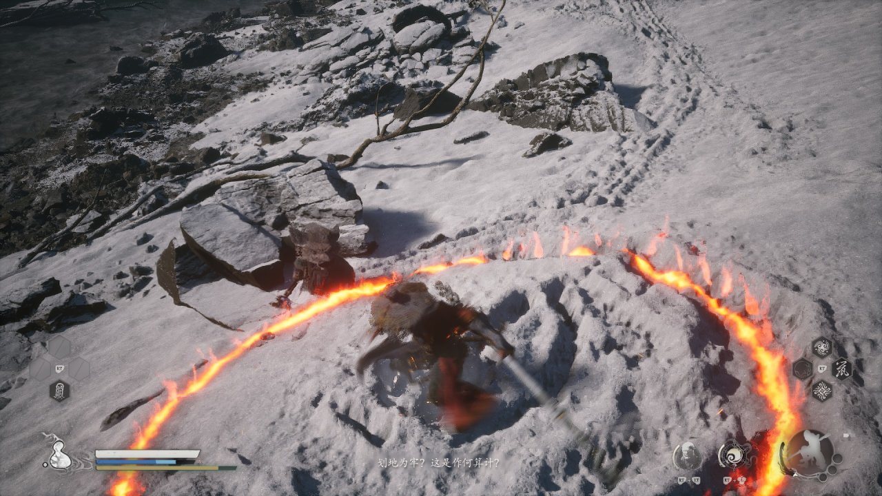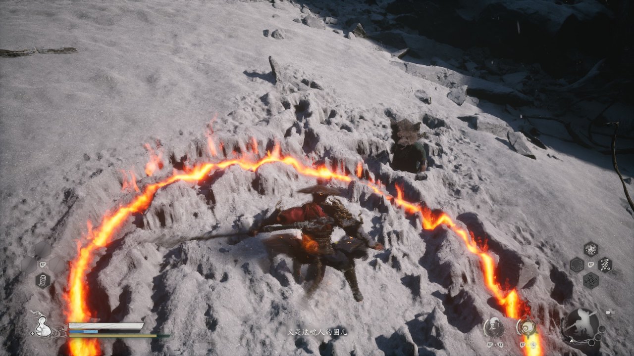 看過《西遊記》的小夥伴肯定記得孫悟空曾在外出化緣時爲保護唐僧在其周圍畫了一個圓圈。悟空用金箍棒畫圈的法術叫”安身法“,這個圈子強似銅牆鐵壁,就是虎豹豺狼、妖魔鬼怪,也近不了身,相當於一個防禦結界。天命人在《黑神話:悟空》第三章前往龜島前二次擊敗赤尻馬猴後,袁守城會教給天命人這個”安身法“技能,在不久後就遇到了八戒(好巧好巧)。