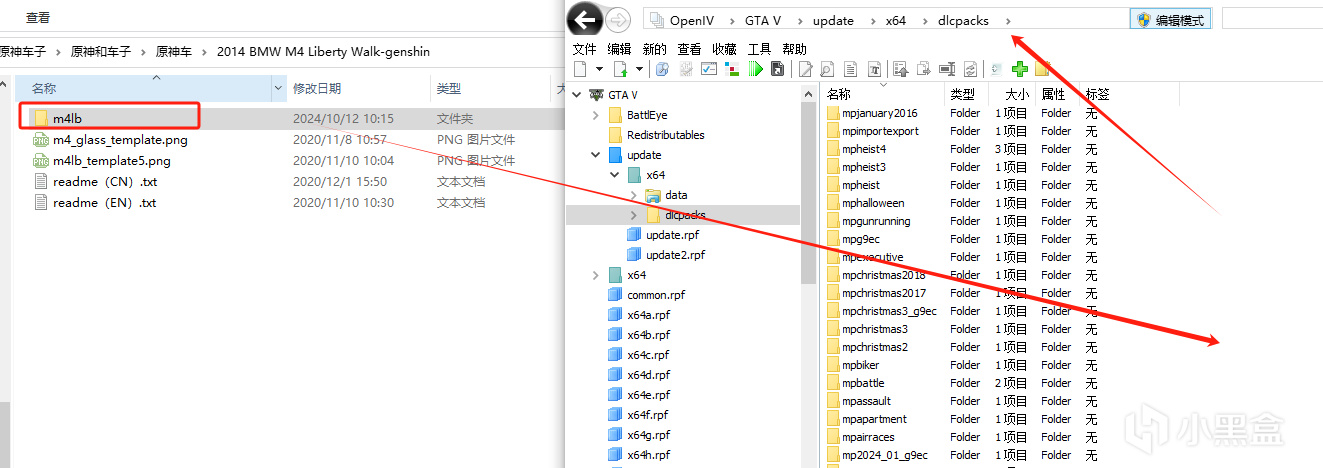 2、將m4lb文件夾拉進openiv文件路徑爲OpenlV>GTAV>update>x64>dlcpacks裏面