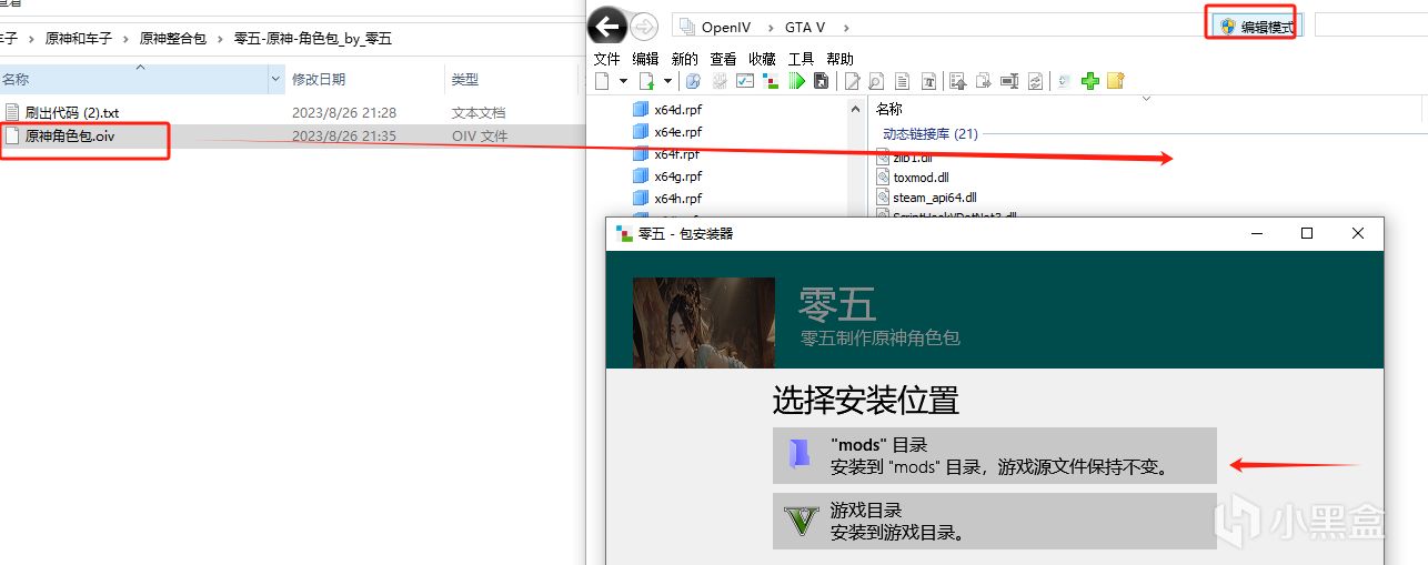 2、將畫框的oiv文件拉進openiv進行安裝到mods文件夾裏面(記得先打開右上角編輯模式)