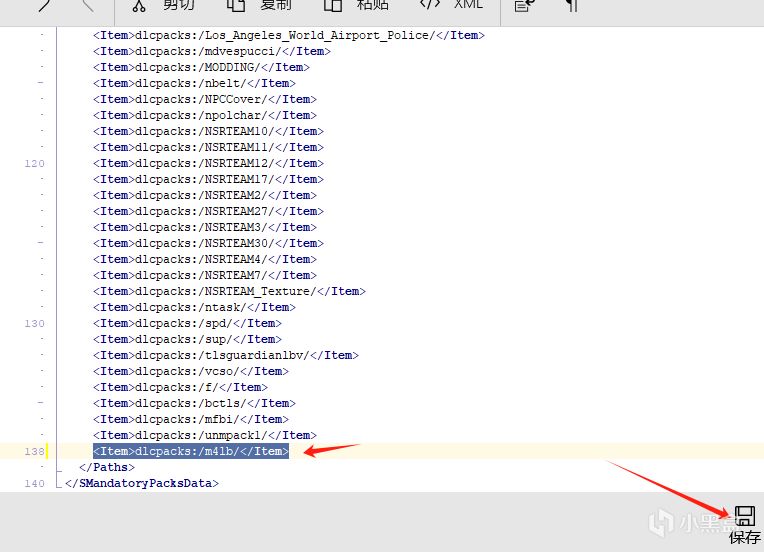 5、將<Item>dlcpacks:/m4lb/</Item>粘貼到下面然後點保存