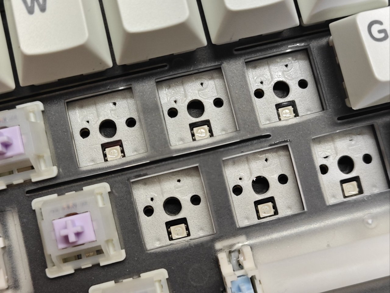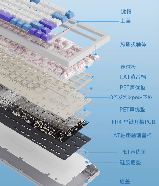 結構方面,F99採用了當下最流行的gasket結構,並在此基礎上做了改良,狼途官方把它命名爲gasket pro結構。而這個結構的優點大家都清楚,不使用螺絲固定,使得鍵盤手感按鍵一致性非常不錯。定位板用的是剛性適中的FR4,爲了更進一步提升手感,甚至做了單鍵開槽。