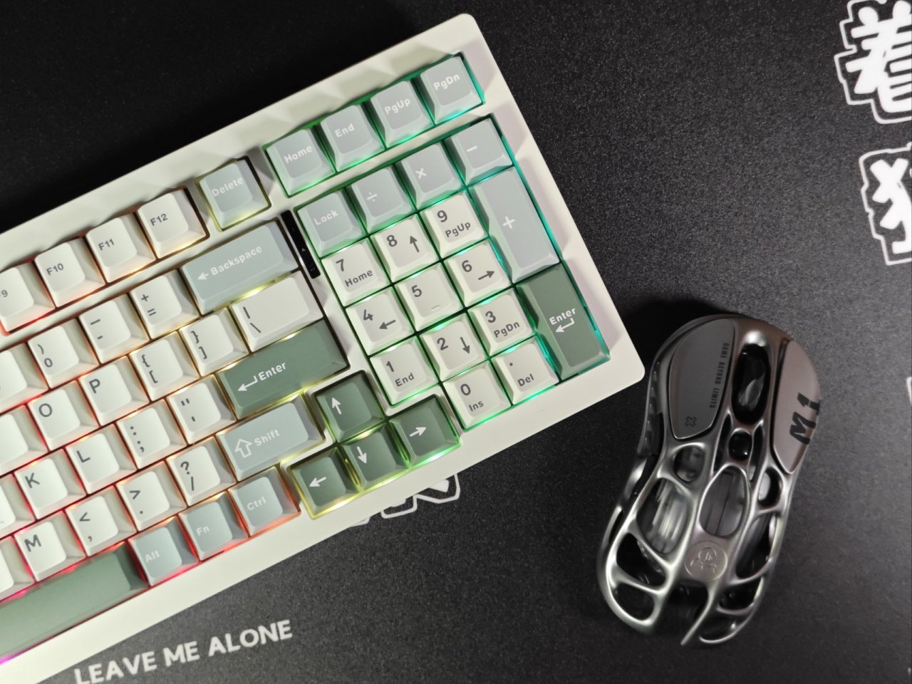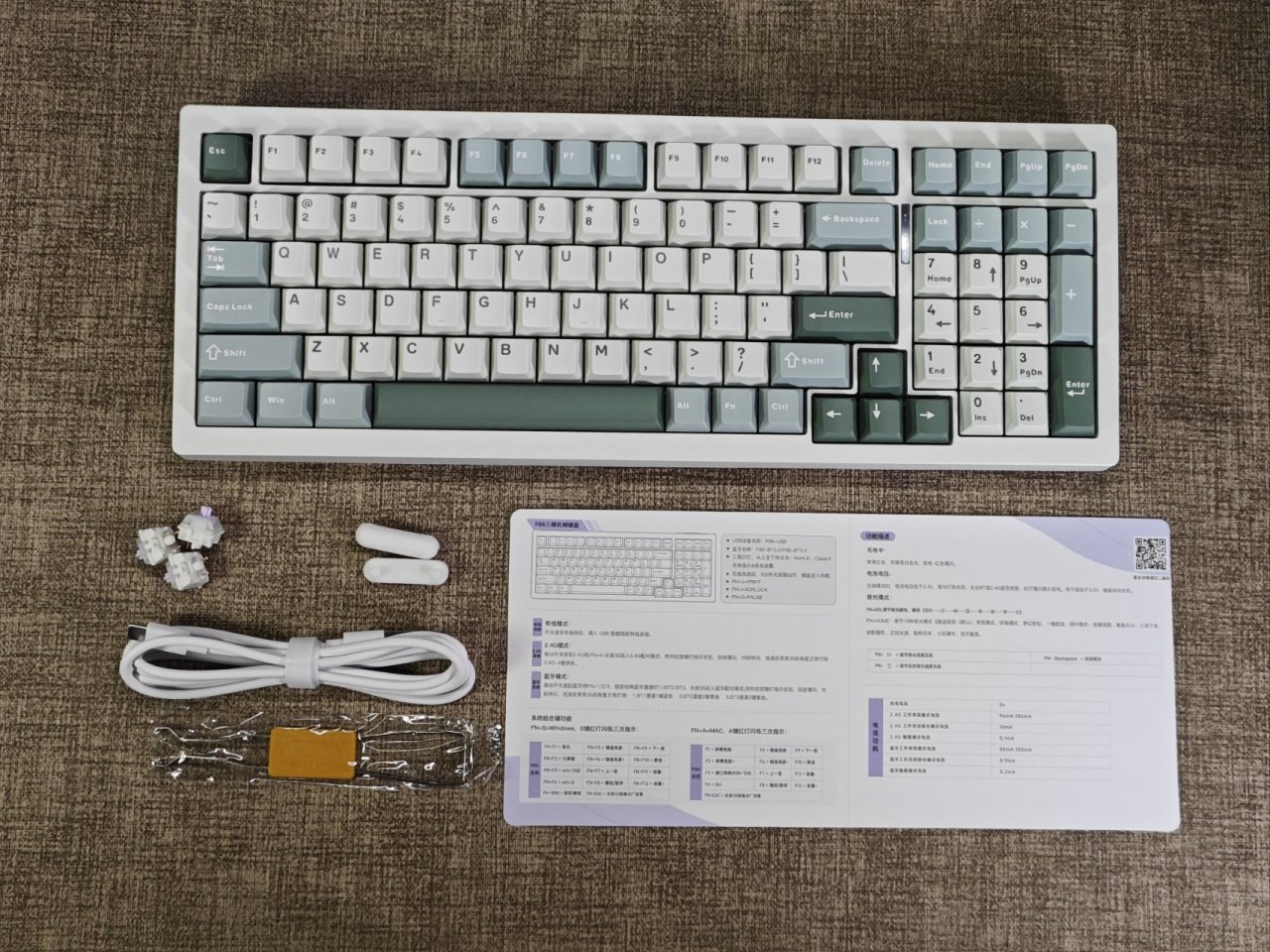 F99給我的第一印象非常不錯,他一共有四個配色,我手上這把是翠微配色,他以非常淡的淡綠色爲主色系,譬如鍵盤的框架及大部分鍵帽的顏色就是淡綠色,不仔細看還以爲是奶白色。鍵帽還會穿插灰綠色及橄欖綠,第一眼看上有一股非常復古的氣息撲面而來。在現在一衆小清新設計的配色中,非常具有個性。且鍵帽採用的是防滑耐打油的PBT鍵帽,耐用性拉滿。