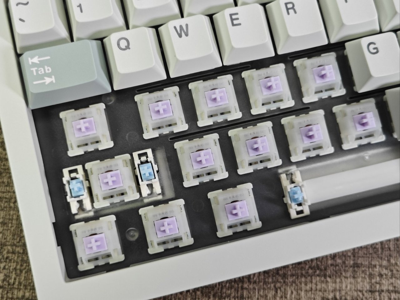 軸體方面,這次F99一共帶來了三款軸體:霧紫軸,馬卡龍軸跟銀玉軸,我這款搭配的是霧紫軸,這是一款兼顧遊戲跟辦公的萬金油軸體。這是一款五針腳的線性軸,軸體出廠自潤,他的總行程爲3mm,導通行程1.8mm,導通壓力38 gf,觸底壓力48 gf。軸體聲音偏悶,爲雨滴音。而得益於多層聲優墊優化,讓軸體觸發的聲音非常純粹,好聽,FR4定位板帶來的剛性,也讓聲音收束更加集中。他的按壓力度適中,即便是長時間辦公碼字也不會累手,較短的觸發行程也可以很好兼顧遊戲性能。