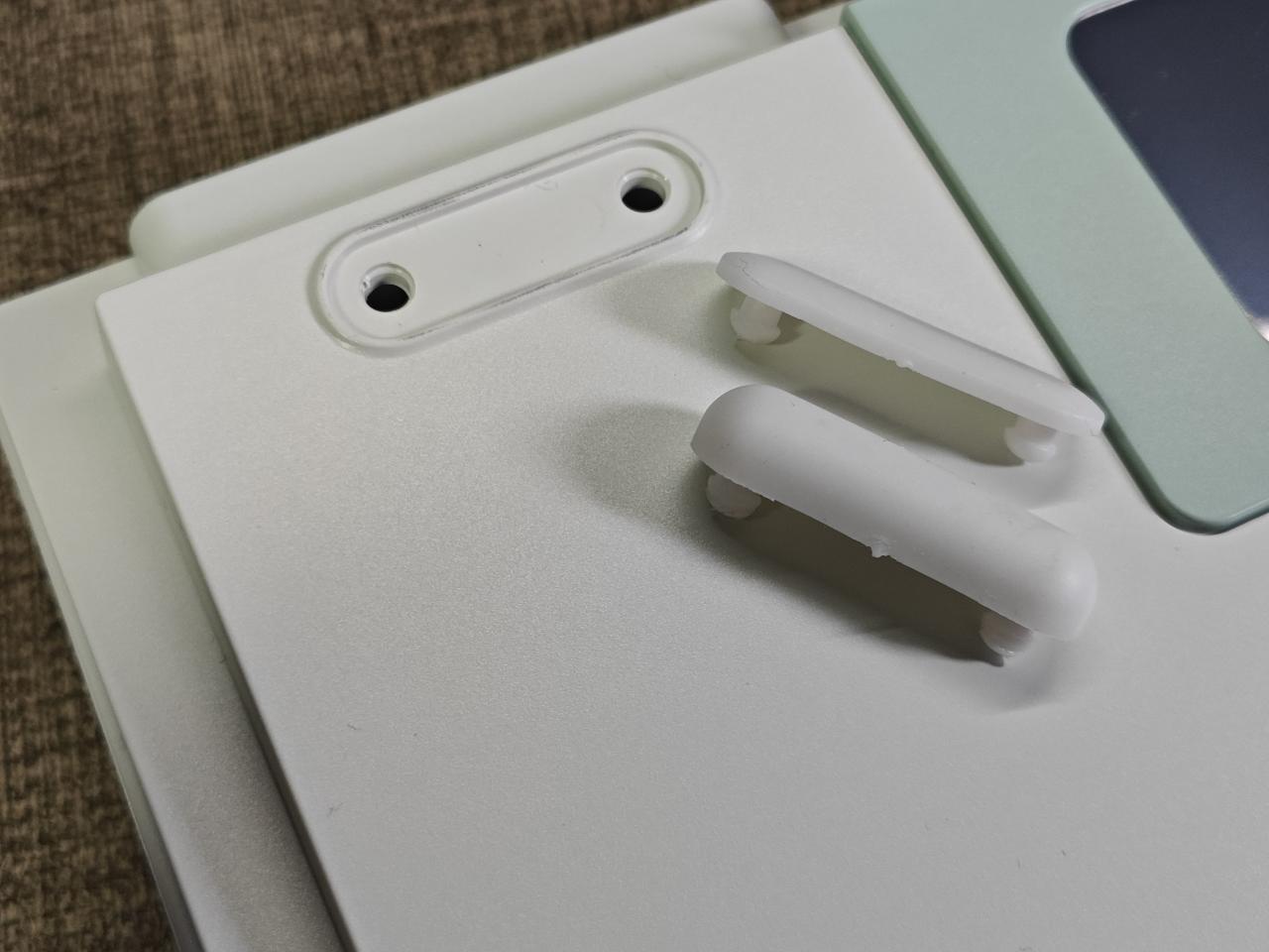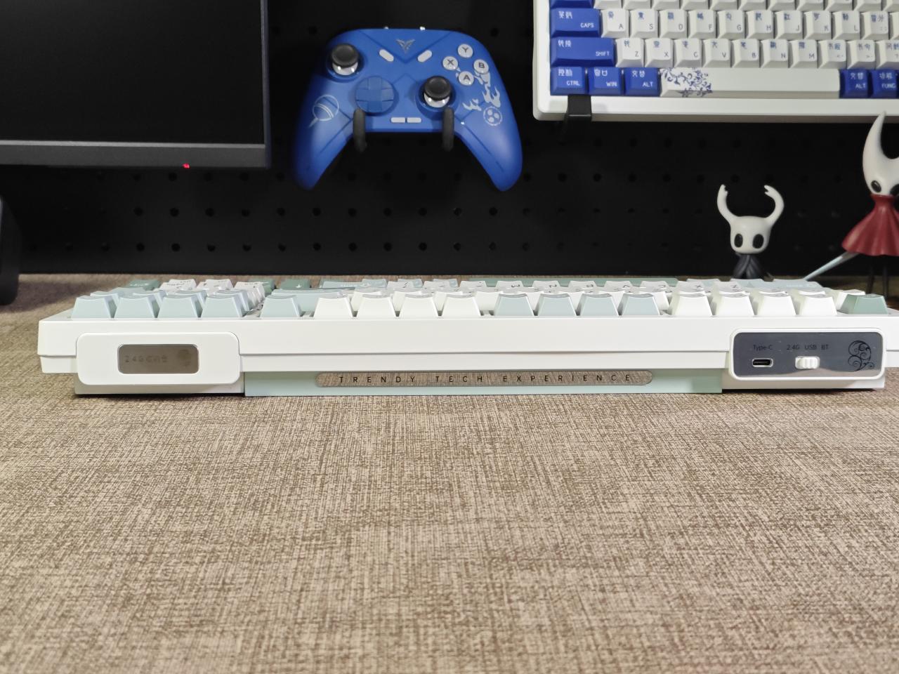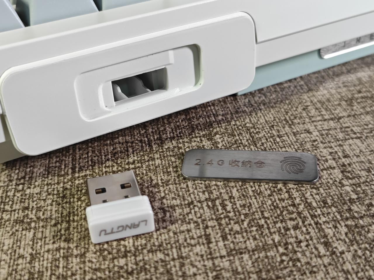 它的頂部設計也有別於其他家,右側位置是鍵盤的三模切換開關及充電口,上面做了特殊圖案設計,非常高檔。中下位置是一條亞克力材質的裝飾條,左側位置是一個2.4g磁吸收納倉。這個充電倉設計確實好看,但是很難拔出來,這點要詬病一下。