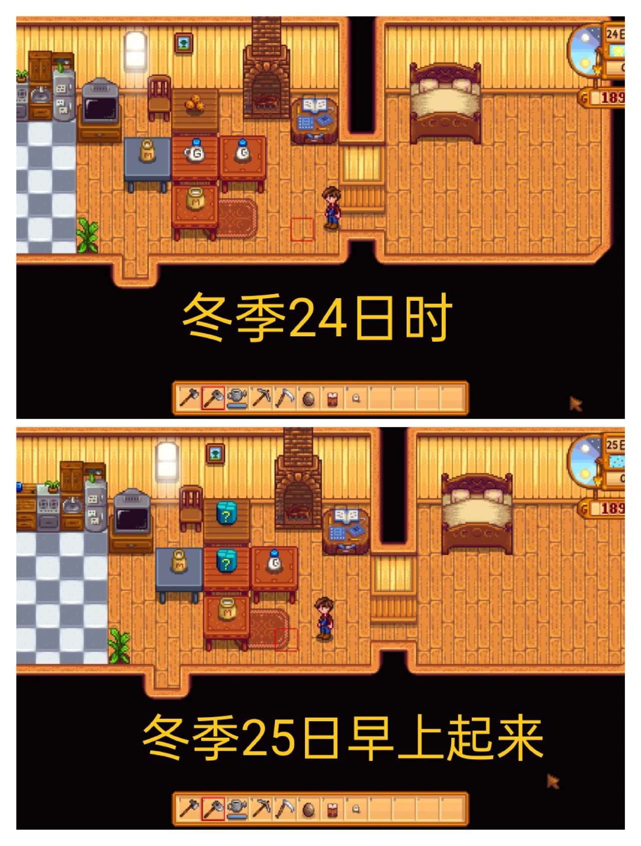在冬季第24日的資金結算界面中會出現兩隻馴鹿拉着坐在雪橇上的聖誕老人,因爲在西方國家的傳統中,聖誕老人都是在聖誕節前夕,也就是平安夜(12月24日)的那天晚上坐着自己的馴鹿雪橇到處送禮物,小朋友在第二天醒來就會在自己牀頭或放置的襪子裏收到禮物,也就是聖誕節當天(12月25日),所以這裏遊戲作者真的很細節,把現實中的西方傳統以彩蛋形式加在了遊戲裏(遊戲中的冬季第24日與現實中平安夜的季節日期相對應)