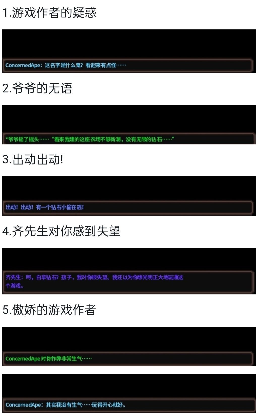 想了解代碼作弊具體內容的玩家可以看這篇文章:《星露穀物語》進階版的代碼使用教程(1.6最新版),我下面就簡單介紹一下這個代碼作弊的意思,代碼大家可以理解爲相當於利用了遊戲的bug去作弊,遊戲作者是知道的,但他並沒有去修復,反而是爲此添加了一些有趣的小彩蛋,當我們到法師的地下室把自己的名字改成某一物品的代碼時,就會出現這些小彩蛋對話,我這裏拿刷鑽石舉例子,一共會在下面五句對話中隨機挑選一句: