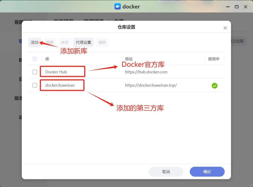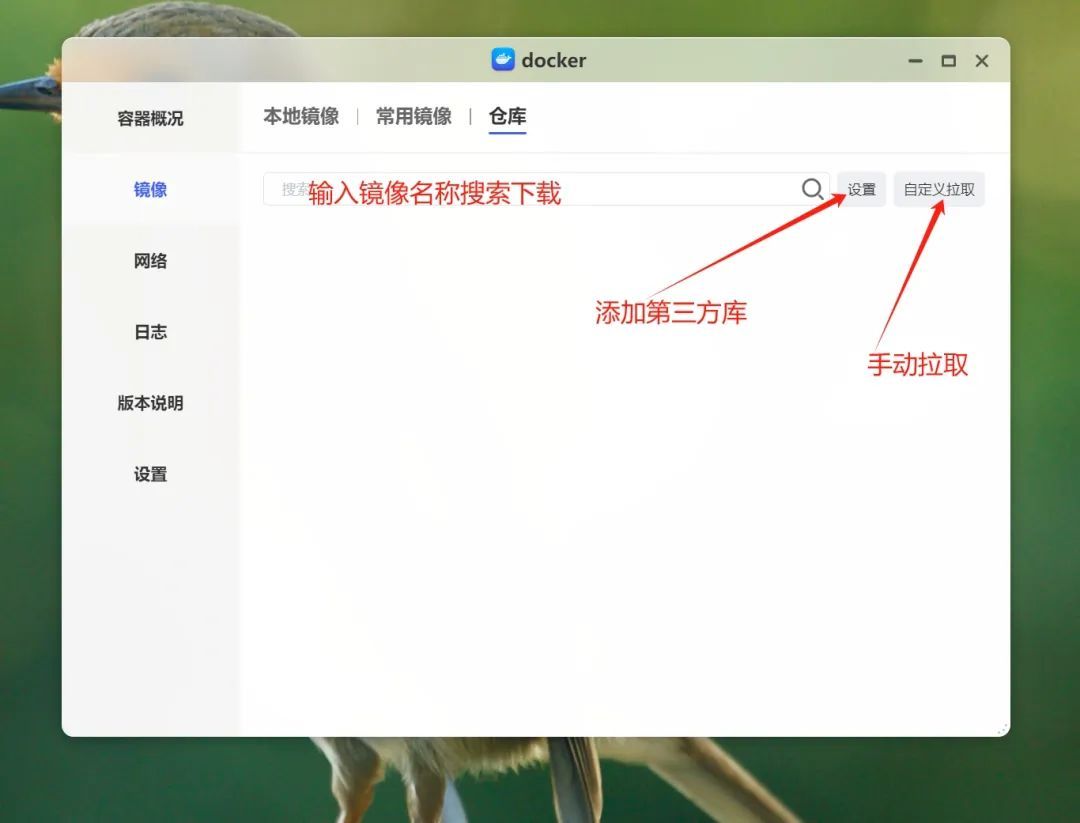 倉庫即鏡像來源,類似於手機的應用商店,可在搜索框搜索自己要下載的鏡像名稱。默認倉庫是Docker官方的庫,點擊設置可添加第三方庫,點擊自定義拉取可手動拉取鏡像。