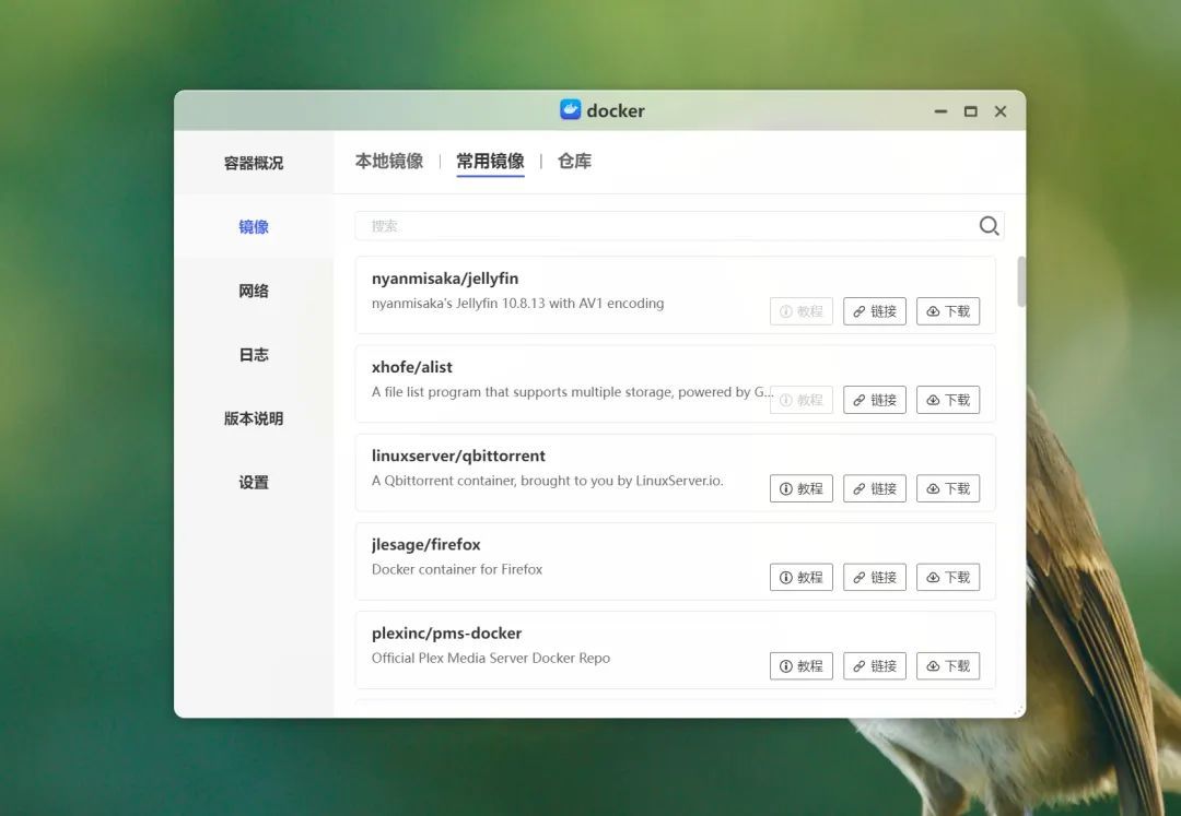 因爲一些原因,Docker官方的鏡像庫連接並不穩定,所以極空間的Docker也提供了一些可供直接下載的常用鏡像,點擊右側的下載即可。