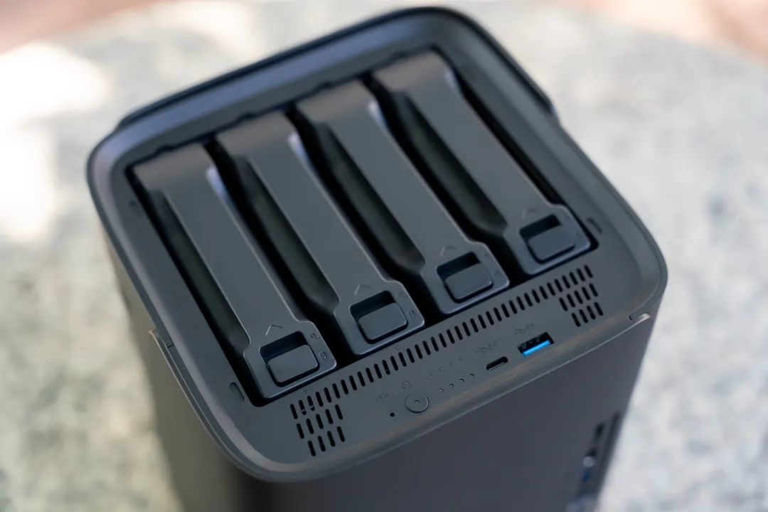 卸掉頂部的磁吸蓋就可以抽出硬盤支架安裝硬盤了,總共有4個SATA盤位,單盤最大容量爲24TB,加起來就是96TB,每個盤位都有對應的指示燈,可藉此判斷硬盤狀態。此外,頂部還有1個USB3.2接口及1個Type-C接口,拓展性很強。