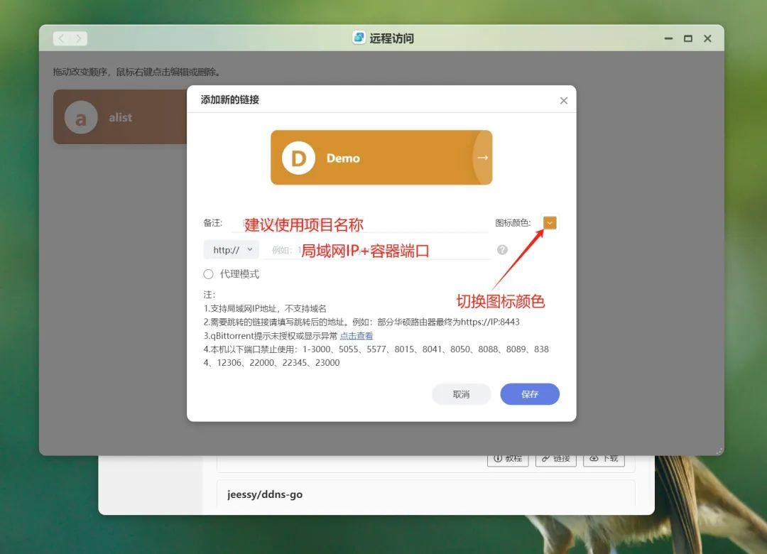 遠程訪問需要電腦端登錄管理員賬戶才能使用,打開之後點擊添加新的鏈接,備註欄可以填容器項目名稱方便區分,然後填寫局域網IP:端口號,根據是否加密選擇http/https。另外還可設置圖標顏色增加辨識度。