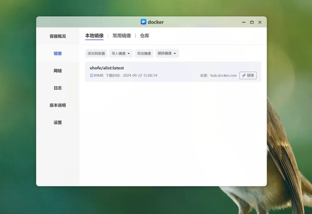 鏡像欄可以查看本地已下載的鏡像,創建容器必須依賴本地鏡像(添加到容器),一個鏡像可以創建多個容器。此外也可以從極空間導入鏡像或將鏡像導出到極空間分享給他人。