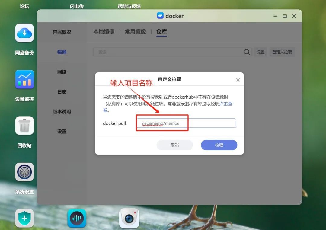 在Docker倉庫中,memos完整的項目名稱爲——neosmemo/memos ,提取口令爲——Docker pull neosmemo/memos。在極空間上手動拉取,直接輸入項目名稱,然後點擊拉取即可。