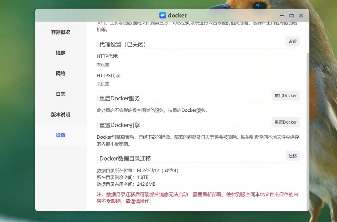 網絡、日誌、版本說明大多數時候都用不到,在設置界面中可以重啓Docker服務、設置代理、重置Docker引擎或者遷移數據。爲了獲得良好的使用體驗,建議將Docker數據存儲在固態硬盤上。