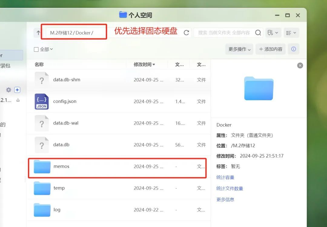 設置文件夾路徑,首先需要打開極空間的個人空間,在Docker文件夾下新建一個memos文件夾。爲了提升運行的穩定性,優先選擇固態硬盤作爲數據存儲盤。