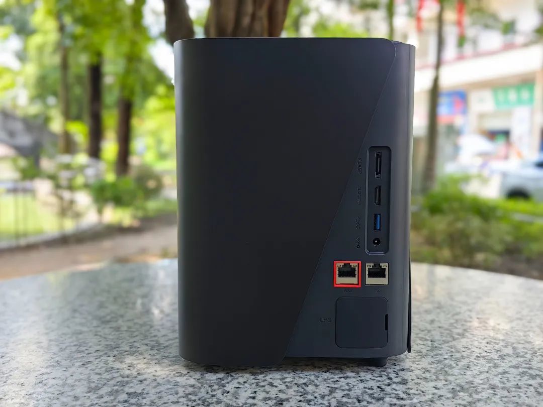 接口主要分佈在機身的一側,非常規整,從上到下分別是eSATA、HDMI、USB3.2、電源插孔、網口、UPS電源插口。值得一提的是HDMI接口並非2.0的,而是傳輸質量更高的HDMI2.1。雙網口其中有紅框的爲萬兆網口。