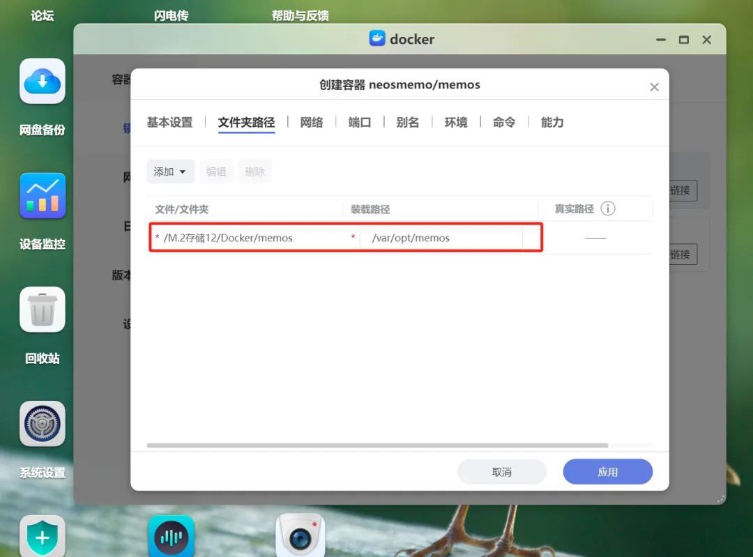 在文件夾路徑中,裝載路徑可不修改,文件/文件夾路徑選擇剛纔新建的memos。