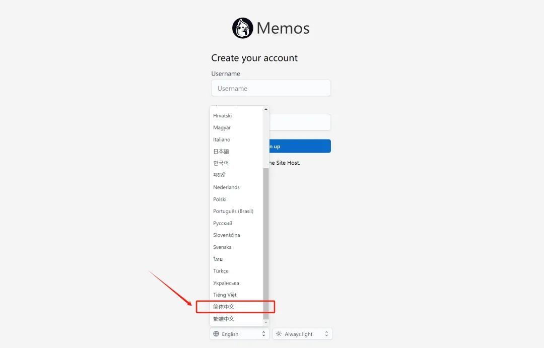 瀏覽器輸入極空間IP:memos端口打開,即可進入memos管理界面,首次使用需要先註冊一個管理員賬號,然後可以在頁面下方將語音切換成中文。