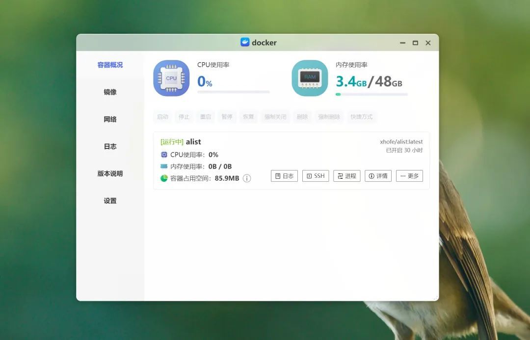 如果沒有相關基礎的話,可能會覺得Docker用起來比較複雜,但其實極空間內置的Docker界面相比其他NAS要簡潔很多。在極空間電腦端點擊Docker圖標後就會進入如下界面,容器概況顯示的是當前容器運行的情況,可以對單個容器進行暫停、重啓、重新編輯等操作。