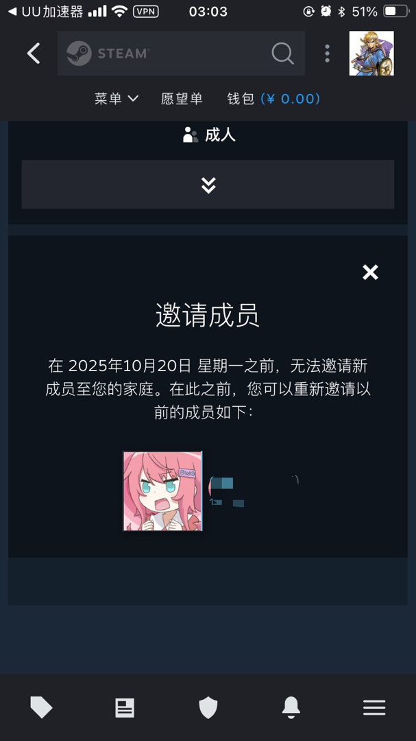 後話:原本我以爲席位冷卻時間是踢掉成員後席位空缺纔開始算的,但事實並不是這樣。由此可得,只要成員在家庭裏待夠一年,踢掉成員後可以秒拉新人且成員也可以秒進新家庭(按steam所說的家庭理念來說非常合理)。