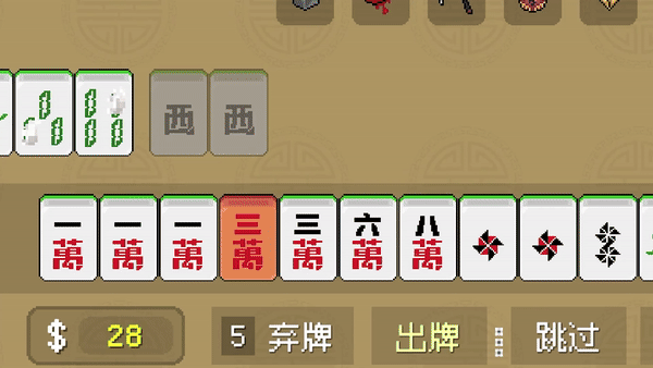 其一,是被改進過的出牌機制。《小丑牌》裏玩家每次出牌獨立,打出的牌互相不影響;但是在《青天井》中,因爲要遵循麻將「四面子+一雀頭」的胡牌規則,所以製作組十分天才地將四個面子拆分爲“四次出牌”——你每次都需要打出「一面子+一雀頭」,前三次只保留面子,最後一次打出的面子和雀頭與留在牌桌上的牌組成最終牌型。