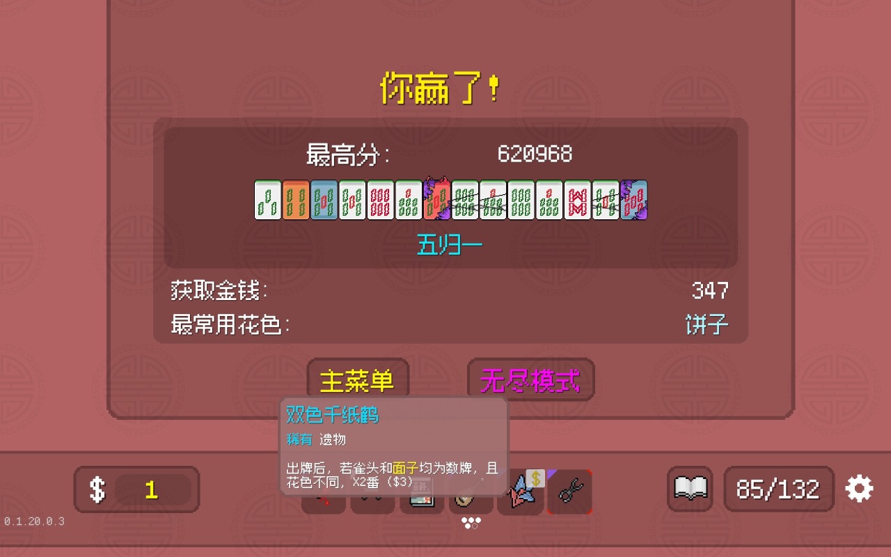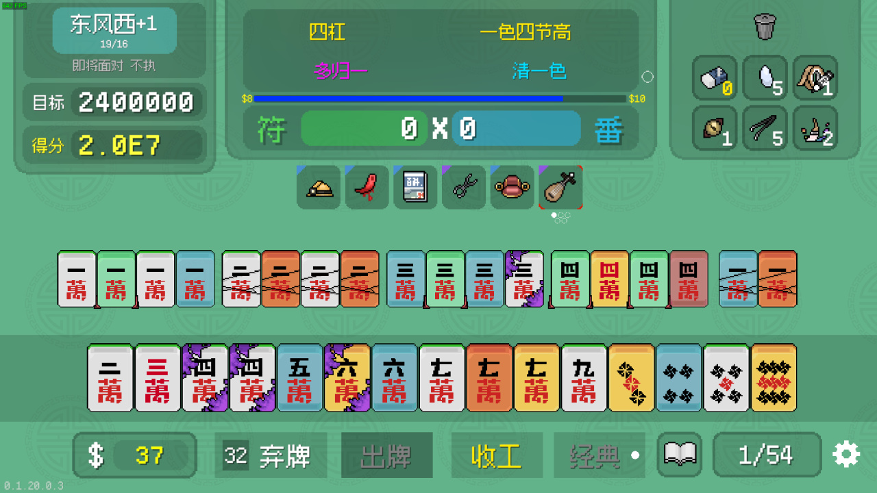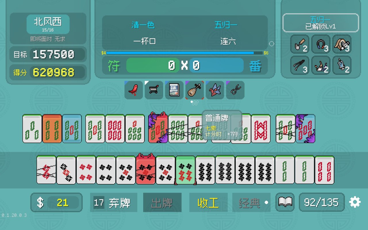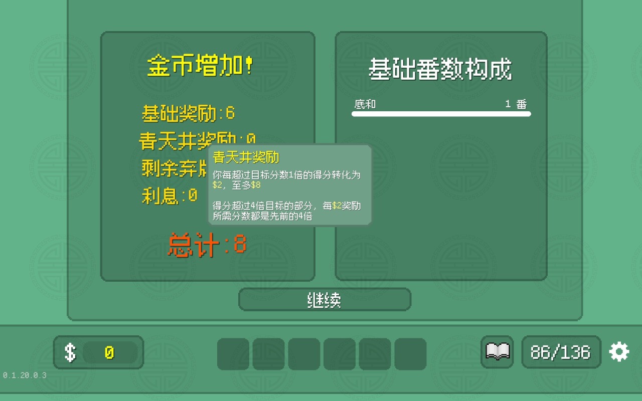 依然是每次出牌單獨計分,但是根據面子對應番種數目,所疊加的倍數也不一樣,所以最後一次出牌的得分通常是最大。當然,只要目標分數足夠,你也可以選擇不用完出牌次數,這裏製作組還設計了一個巧妙的經濟平衡:如果玩家有額外的棄牌次數可以加錢,分數超過目標值對應數額也可以加錢,就看玩家怎麼取捨了。(根據我的體驗,前期留棄牌、後期留出牌收益最高)