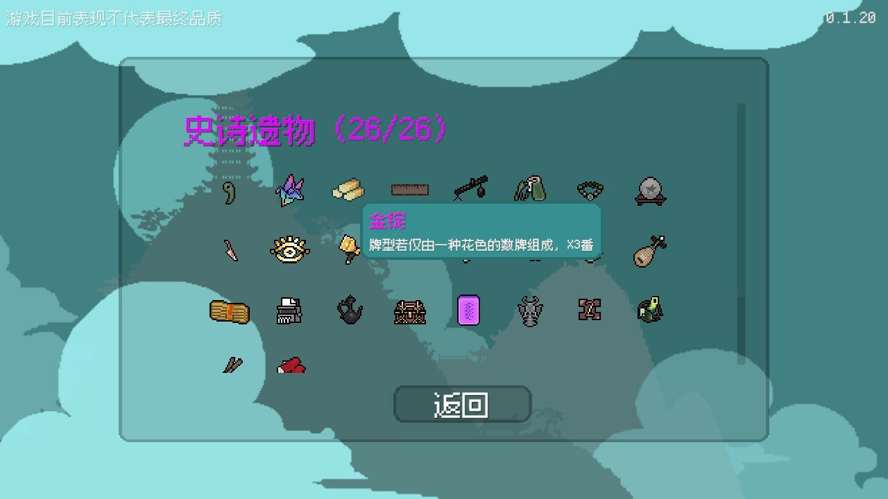 但因爲麻將相比德撲的複雜度,尤其本作還是把天南海北國標日麻一股腦全往裏裝的“縫合麻將”,所以海量的番種記憶對麻將小白來說可能確實是個挑戰,但不要緊,你把它當成《小丑牌》來進行構築就好了,無非就是把小丑換成遺物,塔羅牌換成道具嘛!