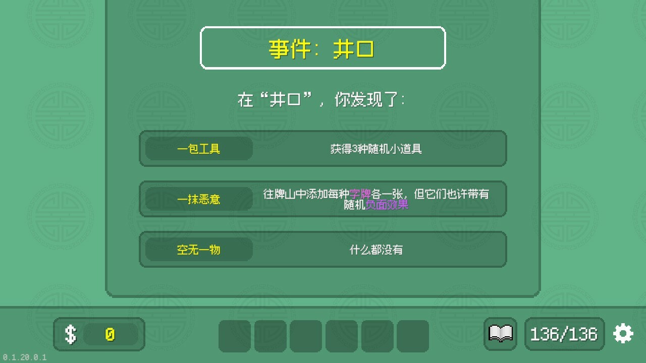 其二,是大大增加的修改牌組機會。在《小丑牌》中,除了極個別的小丑以外,只有塔羅牌可以修改卡組,因此玩家強化or刪卡的幾率並不高,一是沒錢,二是收益不高;不過在《青天井》中可就翻身做主人了,不僅戰鬥結束後會白嫖一個番種卡包和一些小道具,還會額外插入一個“事件”,讓玩家憑空增加許多“白嫖”強卡和刪卡的機會。